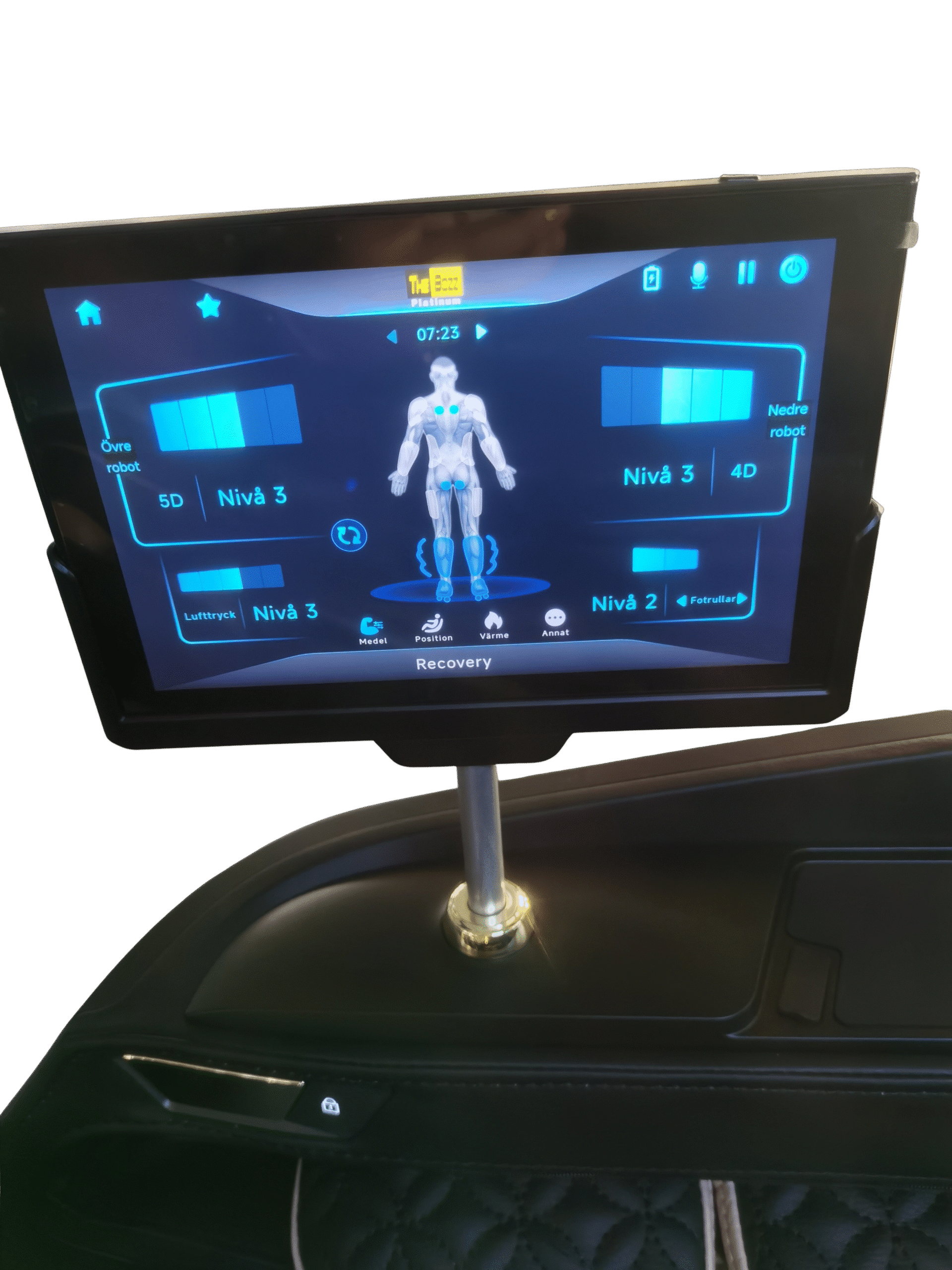 The Bozz Platinum 5D, en ny era av massage. Öppningsbara armstöd, enkelt att kliva in. Fullständig kontroll över din massage, 40 olika programval, ställ in precis som du önskar. Med ljus, aroma och ljudterapi kan du nu skapa din egna oas. Med dubbel massagemekanism får du massage både i axlar nacke och sätesmusklerna samtidigt plus IR värme i massagerullarna som tränger på djupet. 8 TUMS trådlös skärm med Svenska menyer och bruksanvisning i skärmen.